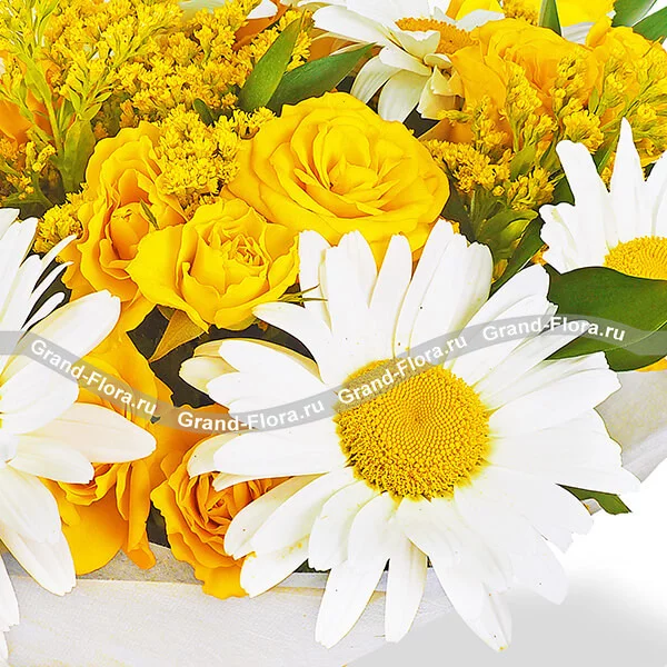 Стандартный (на фото): ромашка белая - 7 шт, роза кустовая желтая - 5 шт, солидаго - 4 шт, рускус, фетр светлый, желтый бант.