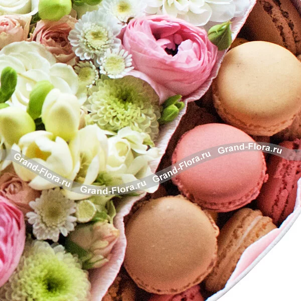Стандартный (на фото): хризантема белая - 1 шт., хризантема белая (сантини) - 2 шт., фрезия белая - 4 шт., рунункулюс розовый - 5 шт., роза кустовая розовая - 1 шт., оазис, макарунс - 15 шт., коробка большая в виде сердца (30х30см).