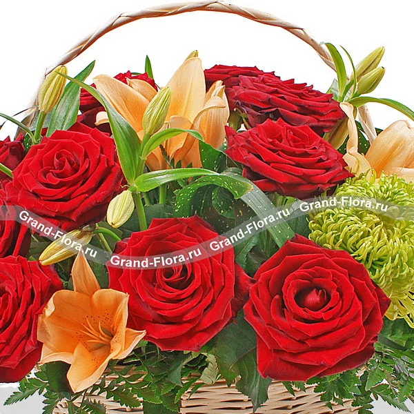 Стандартный (на фото): роза красная (50 см) - 15 шт., лилия желтая (по сезону. возможна замена на белую) - 3 шт., хризантема одноголовая зеленая - 3 шт., салал, папаратник - 6 шт., оазис, корзина.
