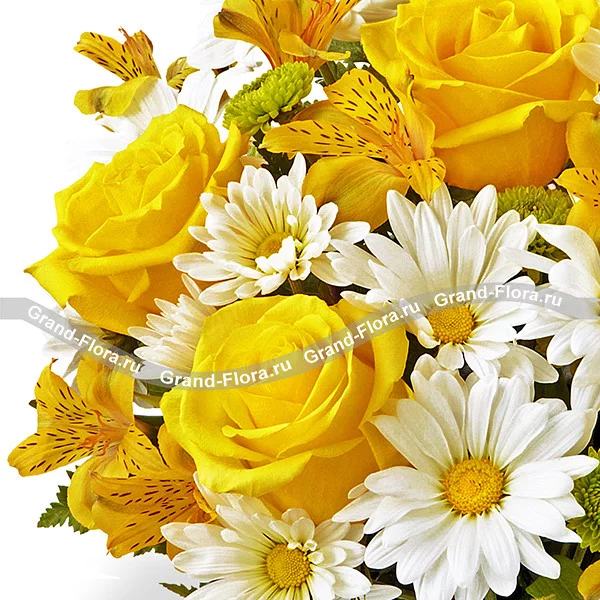 Стандартный: роза желтая - 5 шт., хризантема белая кустовая - 2 шт., хризантема зеленая (сантини) - 1 шт., альстромерия желтая - 3 шт., папоротник - 2 шт.