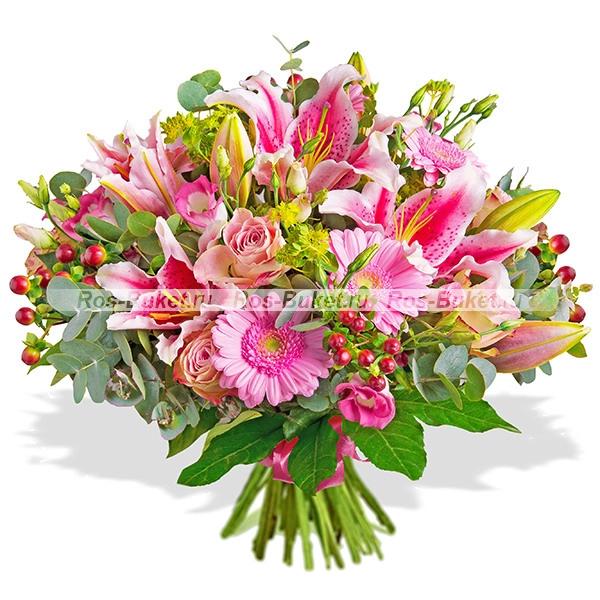 лилия розовая - 3 шт., роза розовая - 7 шт., гербера розовая - 5 шт., эустома розовая - 3 шт., гиперикум красный - 4 шт., эвкалипт - 4 шт., рускус - 4 шт., бант розовый.