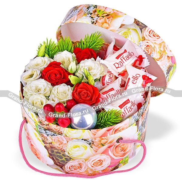 Стандартный: роза красная - 3 шт., роза кустовая белая - 3 шт., гиперикум - 1 шт., ель, конфеты Raffaello, елочная игрушка – 1 шт., оазис, коробка.