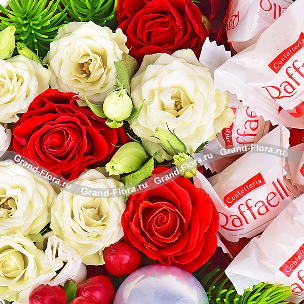 ДЕЛЮКС: роза красная - 9 шт., роза кустовая белая - 8 шт., гиперикум - 4 шт., ель, конфеты Raffaello, елочная игрушка – 4 шт., оазис, коробка.
