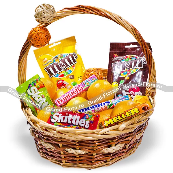 Стандартный: апельсин - 1,5 кг., конфеты "Mentos" - 1 шт., конфеты "Meller" - 1 шт., конфеты "Fruit-tella" - 1 шт., конфеты "Skitlles" - 2 шт., конфеты "M&Ms" - 2 шт., декор, корзина.