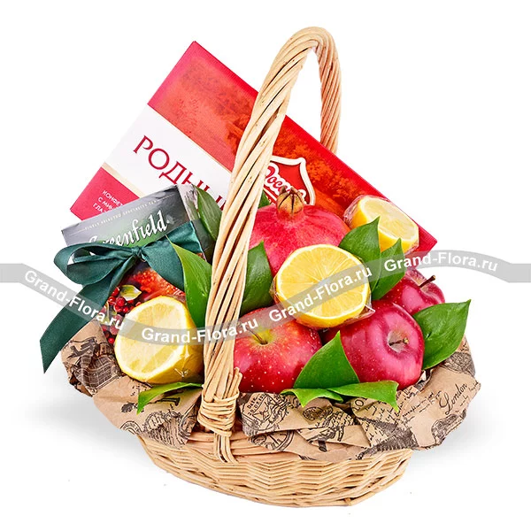 Стандартный: чай "Greenfield", конфеты "Родные просторы" - 200 гр., яблоки - 3 шт., гранат - 1 шт., лимон - 2 шт., корзина, декоративная зелень, лента.