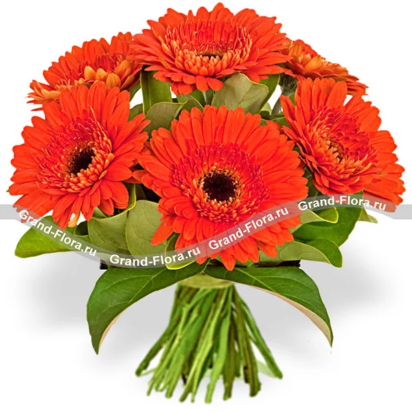 Стандартный: гербера оранжевая - 7 шт., салал - 4 шт., упаковка, лента зеленая.