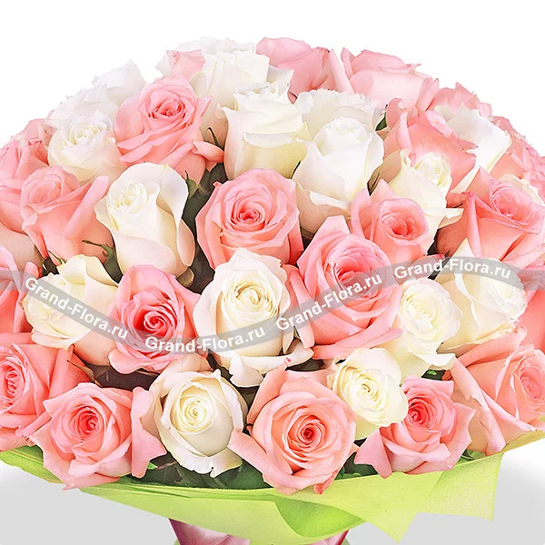 Букет белых роз и розовых роз (акционный букет, высота роз 40-50 см) Роза белая, роза розовая - 101 шт., упаковка, лента.